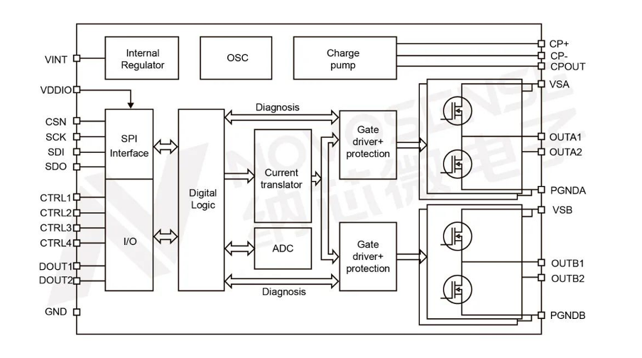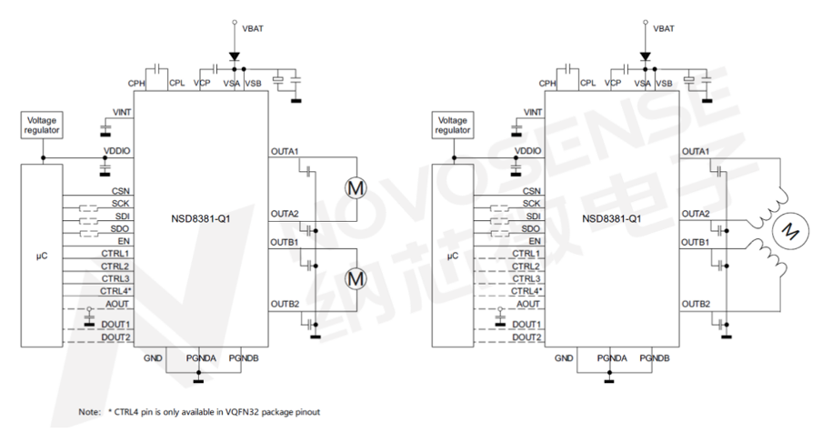 The NOVOSENSE NSD8381-Q1 is an advanced automotive-grade programmable stepper motor driver designed to meet the increasing demands of EV applications like headlight adjustment, HVAC systems, and HUDs. It supports a wide operating voltage (4.5 V to 36 V) and offers up to 1.35 A current with 1/32 micro-stepping resolution. Its integrated SPI communication allows for flexible configuration, while the sensorless stall detection ensures real-time monitoring of motor conditions, helping avoid system failures. It also integrates advanced features like full-bridge and half-bridge motor control (fig. 2), offering unparalleled flexibility for managing complex automotive systems.