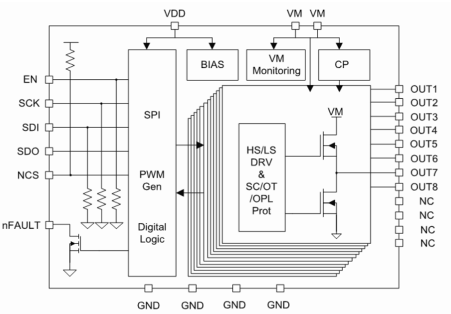 Figure 3: The NSD830x-Q1 not only offers an SPI interface and multi-channel drive mode but also features various additional functions to flexibly support a wide range of loads