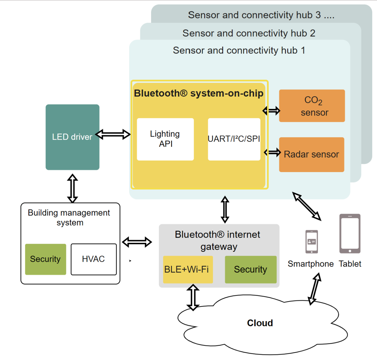 For achieving that indoors, building wide connectivity that enables every smart lighting use case, new and established, Bluetooth Mesh has become one of the key technologies in most leading systems implementations, thanks to its reliability, security, and near-universal interoperability. One major benefit to smart facility managers looking to install such a mesh is that Bluetooth devices that can be deployed as local control elements are ubiquitous and easy to obtain, while standardized, mature BT mesh stacks are easily available.