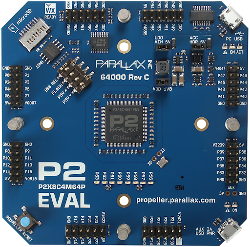 The Propeller 2 Eval Board is designed for experimentation and characterization of the Propeller 2 multicore microcontroller. The Propeller 2 features a user-code adjustable operating frequency, and has been designed to operate at a maximum recommended clock frequency of 180 MHz.