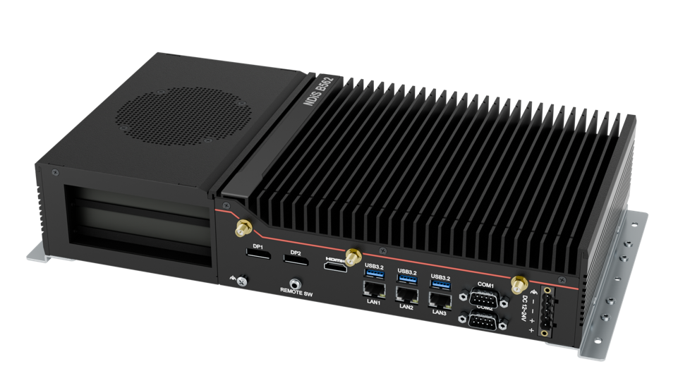 The NDiS B562 is a fanless embedded computer with modular scalability, supporting Intel Core processor (Series 2). Its DockInfinity expansion dock provides one half-height PCIe 4.0 x16 slot for a GPU to boost AI workloads, or two PCIe 4.0 x8 slots for added functionality. Operating on 12–24V DC, it ensures stable performance under fluctuating power. Standard I/O includes three USB 3.2, two USB 2.0, two COM ports, one HDMI 2.0, and two DisplayPort 1.2.