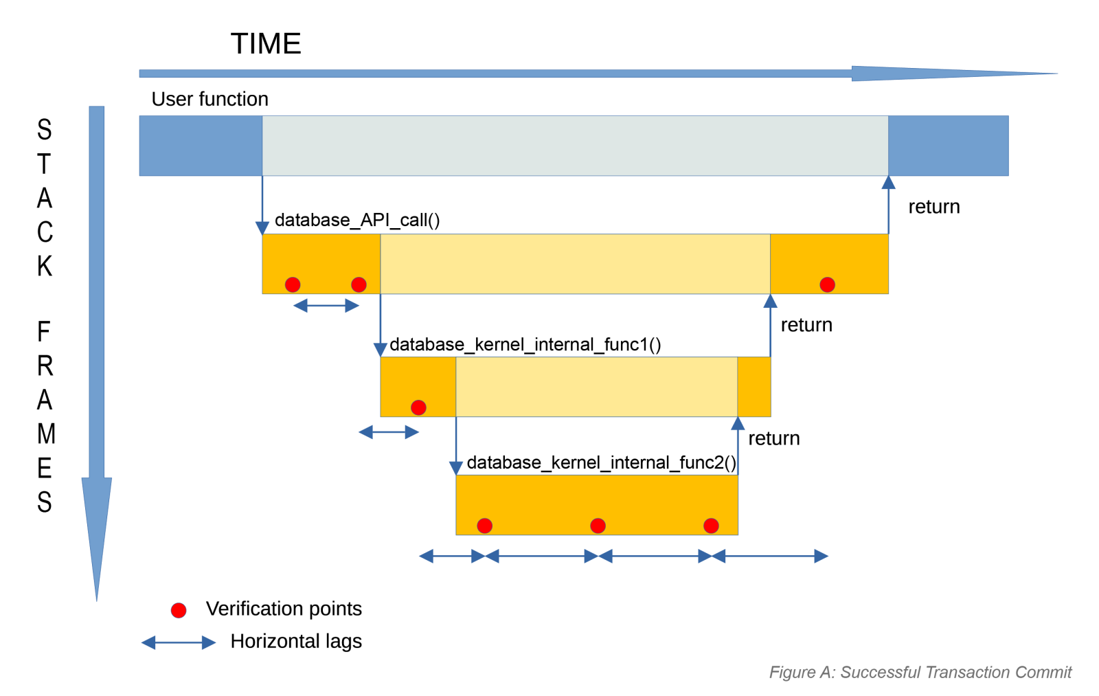 2. The number of instructions executed when returning from nested calls — the vertical lag. To minimize this delay, the database kernel uses standard C library function longjmp() to quickly unwind the stack back to a known state. Before that jump, a chain of cleanup callbacks run to release locks, restore internal structures, and bring the system back to a consistent state.