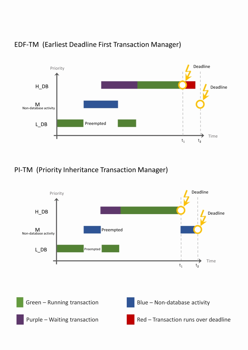 From a practical standpoint, the choice between PI and EDF transaction managers depends on the system’s workload. The PI Transaction Manager fits best in systems that mix database work with CPU-heavy tasks that don’t touch the database. In those cases, priority inversion can become a real issue. The EDF manager coordinates locking only among database threads. When a database thread is blocked, it simply yields the CPU and waits, but threads that run outside the database keep going. If they preempt a lower-priority thread holding a database lock, priority inversion can happen.