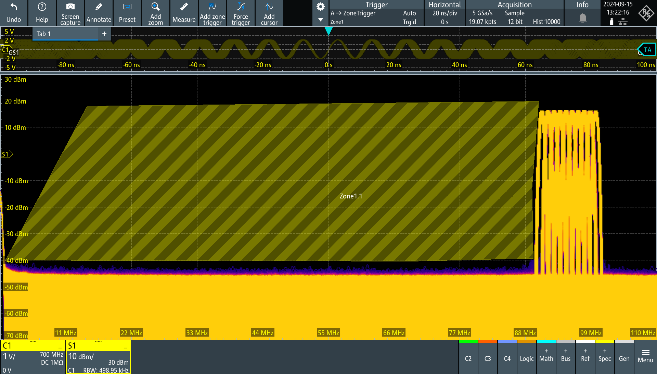 Figure 3: In this example, the user has set a zone trigger in the frequency domain on the MXO 4. The oscilloscope will capture and display acquisitions where the carrier and sidebands have levels consistent with the drawn zone areas.