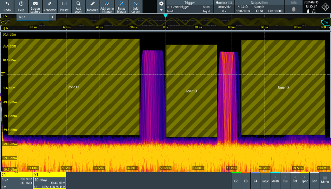 Historically, oscilloscopes trigger exclusively on time domain events. Instruments with FFT capabilities perform the transformation post-acquisition have not included any frequency domain triggering capabilities. Several oscilloscope families offer zone triggering that also works in the frequency domain as shown in Figure 3. Users can specify graphically what frequencies and power levels cause the oscilloscope to trigger using zone triggering areas.