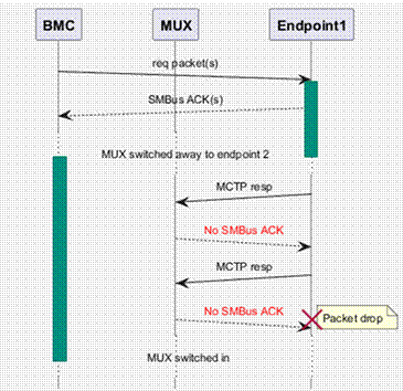 This architecture introduces complications for higher-level system management protocols like DMTF’s Management Component Transport Protocol (MCTP) and Security Protocols and Data Models (SPDM), which rely on query-response transactions. When using these protocols, the BMC must wait for each query-response transaction to be fully completed, tying up the bus and preventing other devices from communicating. For example, an SPDM cryptographic transaction can take up to 100 ms to complete, an unacceptable delay in large data centers with thousands of devices, where MUX switching creates a significant risk of communication glitches and failures.