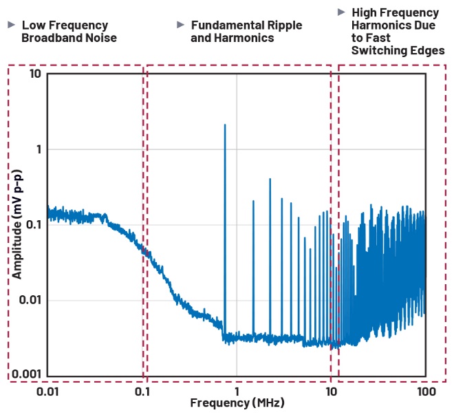 Figure 1 shows the noise frequency spectrum of a typical buck regulator operating in steady-state pulse width modulation (PWM) operation.