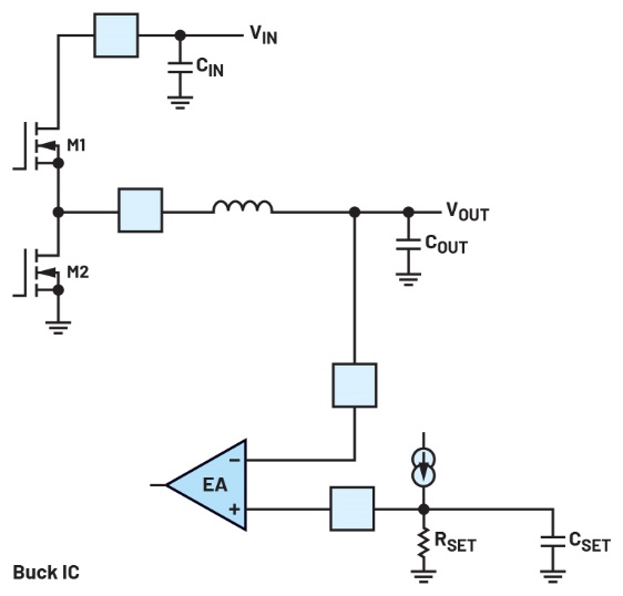 Current reference architecture is a design approach where a precise current source, rather than a traditional voltage reference, serves as the core element for regulating the output voltage. It has a unity-gain error amplifier, and the output voltage can be easily set by a single resistor. The approach is particularly advantageous in linear regulators and is increasingly being adopted in switching converters to meet the demands of high-performance applications. This can be seen in Figure 10 from a buck IC.