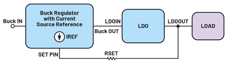 By utilizing DC-to-DC converters with current source reference features, a function that is similar to the VIOC feature of advanced LDOs can be implemented in a clever and efficient manner. In this setup, the first stage switching converter uses the current source reference at its SET pin and connects it through a resistor to the output voltage of the second-stage LDO, enabling dynamic headroom control and improved noise performance.