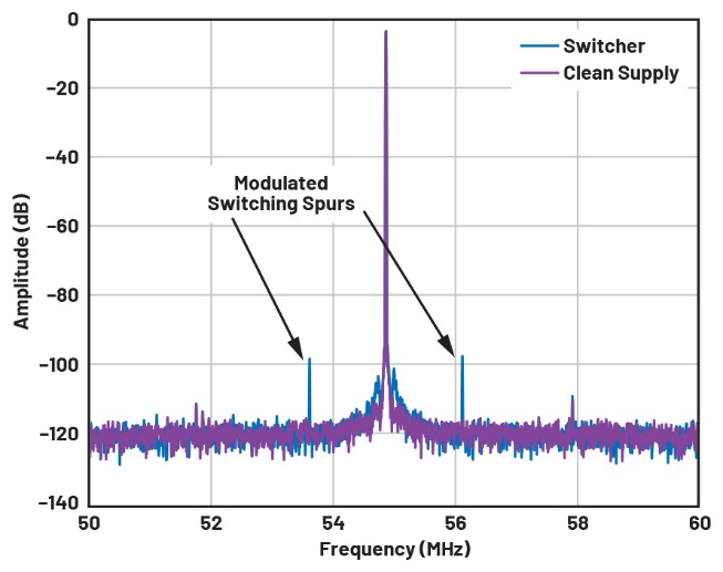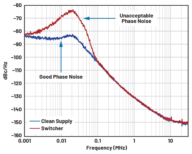 Typical buck regulators typically generate low-frequency broadband noise that primarily originates from reference noise. This can lead to phase noise issues in sensitive RF components, such as wideband phase-locked loop (PLL) synthesizers with an integrated voltage-controlled oscillator (VCO), as shown in Figure 2.