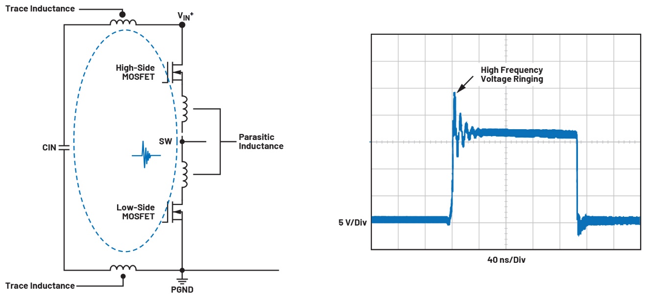 A third noise region involves high-frequency harmonics, which arise from voltage ringing at the switch node. This ringing is caused by the combination of fast switching transitions (di/dt) and parasitic inductance within the regulator’s input loop, as shown in Figure 4, further contributing to EMI and signal integrity challenges, which can be parasitically coupled to the regulator’s output.