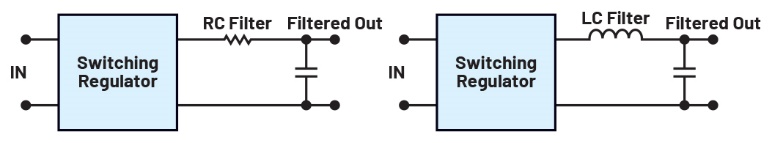 An LC filter is also a common and efficient approach. The cutoff frequency is typically designed to be at least a decade below the switching frequency. It offers a steeper rolloff of 40 dB per decade, providing better attenuation. However, designing an LC filter requires careful attention, particularly to resonance effects, which can unintentionally amplify noise at specific frequencies instead of attenuating it. Both passive filter approaches will impact voltage output accuracy and transient performance. Figure 5 depicts the placement of RC and LC filters following the output stage of a switching regulator.