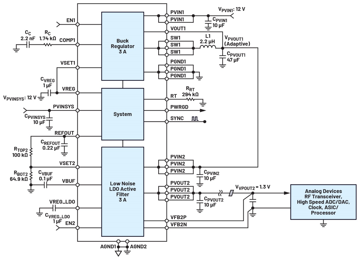 One approach is based on the dynamic changes of the load current. The ADP5003 low noise micropower management IC integrates a high efficiency 3 A buck regulator on the first stage of conversion, followed by an ultralow noise 3 A LDO, to remove the switching ripple and noise. It offers an adaptive headroom control configuration that delivers enhanced efficiency and thermal performance while minimizing noise suited to high-speed data converters and RF transceivers. Figure 6 shows the functional block diagram of the ADP5003 for adaptive headroom control.