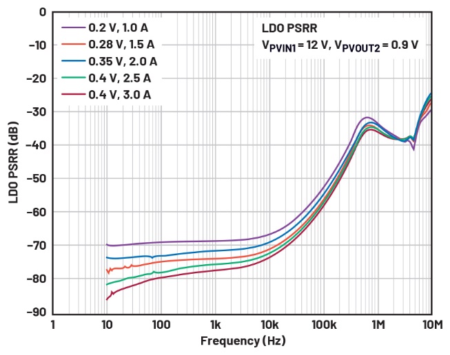 One of the key parameters of an LDO used as a postregulation filter is its PSRR. PSRR quantifies how effectively the regulator suppresses or attenuates noise present on the input supply across a range of frequencies, preventing it from propagating to the output and compromising voltage integrity.
