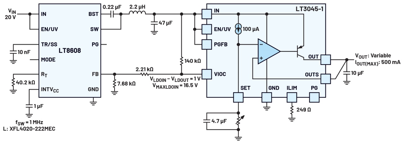 An example is the LT3045-1, which has a VIOC feature. This device is a 20V, 500mA, ultralow noise, ultrahigh PSRR linear regulator. Figure 9 illustrates a typical VIOC application, where it is used to postregulate the output of the LT8608 buck regulator. The VIOC voltage is configured to 1 V, with the LDO’s maximum input voltage limited to 16.5 V. It also illustrates how the input-to-output differential voltage can be easily configured using resistor dividers, allowing designers to tailor the balance between PSRR and power dissipation to suit specific application requirements.