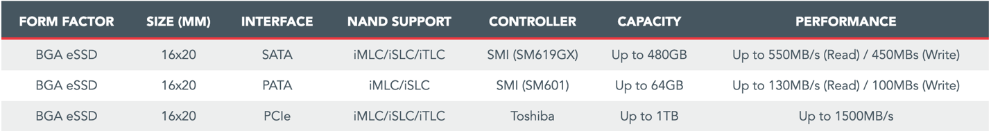 The iTLC NAND geometry enables the BGA SSD’s ability to support higher capacities with larger cells and more storage density. The SSD also supports PCIe, SATA, and legacy PATA interfaces, enabling devices to communicate with multiple host systems ranging from modern to traditional, and allowing the SSD to be utilized in various industries and devices, without the need for a whole system redesign.