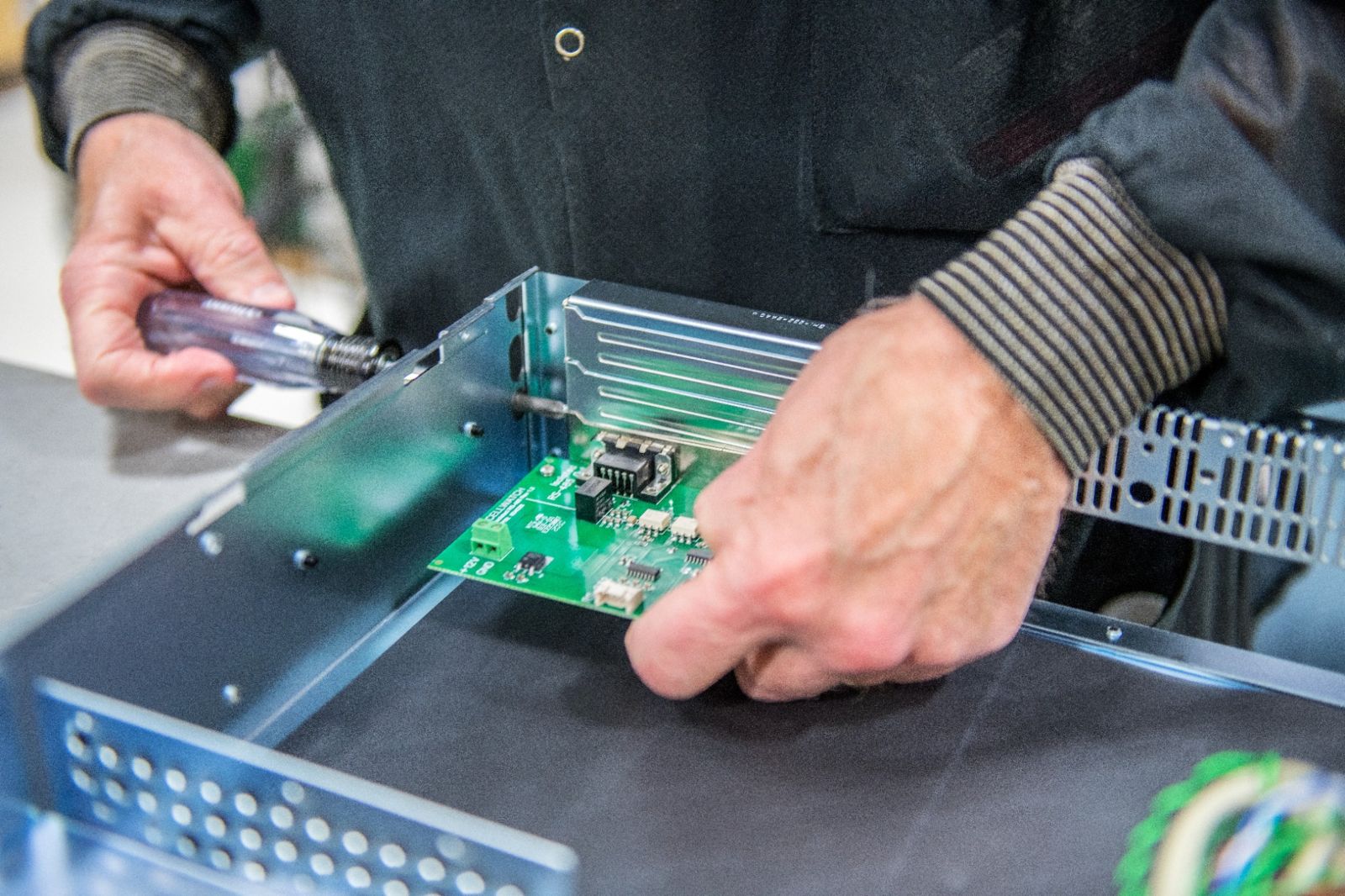Image 2: Technician mounting a circuit board into an enclosure, which is a practical step in the semi-custom approach that reuses existing components to shorten development cycles. (Sealevel Systems)